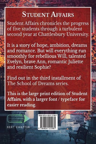 Student Affairs chronicles the progress of five students through a turbulent second year at Chattlesbury University. It is a story of hope, ambition, dreams and romance. But will everything run smoothly for rebellious Will, talented Evelyn, brave Ann, romantic Juliette and resilient Sophie? Find out in the third installment of The School of Dreams series. This is the large print edition of Student Affairs, with a larger font / typeface for easier reading.