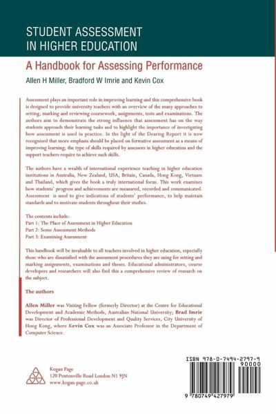 Section A The place of assessment in higher education: purposes of higher education functions of assessment cognitive educational objectives, learning outcomes and levels of testing measuring the outcomes of non-cognitive objectives stages of intellectual and ethical development. Section B Some assessment methods: timing of assessment tasks essays theses objective tests assessing group projects practical skills and field work designing a final examination. Section C Examining assessment: reporting on assessment evaluation of assessment procedures the issue of academic (dis)honesty current and future developments.
