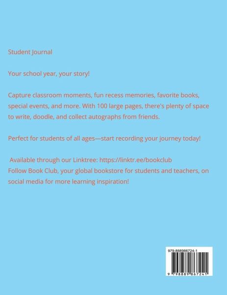 Student Journal Your school year, your story! Capture every moment of your school journey, from exciting classroom activities to unforgettable recess adventures. Document your favorite books, special events, and milestones, and even collect autographs from friends to make this journal uniquely yours. With 100 large pages, there's ample space for writing, doodling, and reflecting on your experiences. Whether you're in elementary school or beyond, this journal is perfect for students of all ages who want to create lasting memories and stay organized throughout the year. Start recording your story today-your school memories deserve to be remembered!