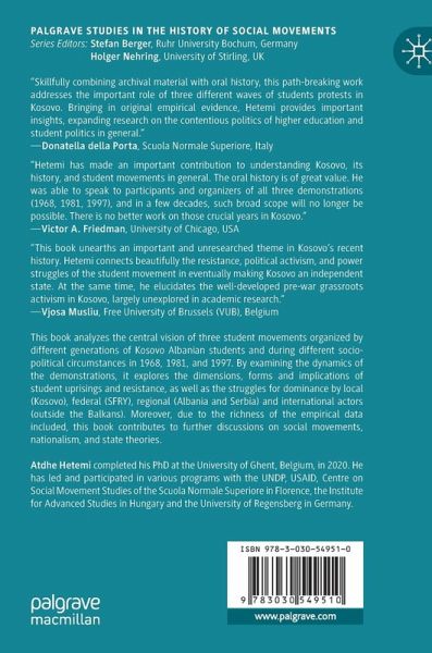 This book analyzes the central vision of three student movements organized by different generations of Kosovo Albanian students in 1968, 1981 and 1997. By examining the dynamics of the demonstrations, the author explores the dimensions, forms and implications of student uprisings and resistance, as well as the struggles for dominance by local (Kosovo), federal (SFRY), regional (Albania and Serbia) and international actors (outside the Balkans). While these demonstrations were organized by students, the book shows that these were not necessarily academic but political, highlighting the impact that students had on society to demonstrate. It examines how the vision for "Republic" status or independence impacted the first and subsequent student movements. Moreover, due to the richness of the empirical data included, this book contributes toward further discussions on social movements, nationalism and state theories.