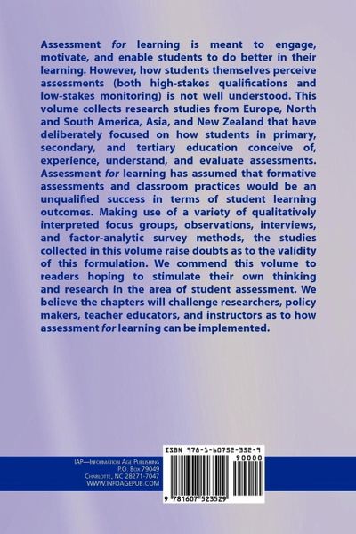 A volume in Research on Sociocultural Influences on Motivation and Learning Series Editor: Dennis M. McInerney, The Hong Kong Institute of Education Assessment for learning is meant to engage, motivate, and enable students to do better in their learning. However, how students themselves perceive assessments (both high-stakes qualifications and low-stakes monitoring) is not well understood. This volume collects research studies from Europe, North and South America, Asia, and New Zealand that have deliberately focused on how students in primary, secondary, and tertiary education conceive of, experience, understand, and evaluate assessments. Assessment for learning has assumed that formative assessments and classroom practices would be an unqualified success in terms of student learning outcomes. Making use of a variety of qualitatively interpreted focus groups, observations, and interviews and factor-analytic survey methods, the studies collected in this volume raise doubts as to the validity of this formulation. We commend this volume to readers hoping to stimulate their own thinking and research in the area of student assessment. We believe the chapters will challenge researchers, policy makers, teacher educators, and instructors as to how assessment for learning can be implemented.