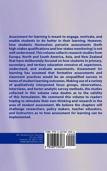 A volume in Research on Sociocultural Influences on Motivation and Learning Series Editor: Dennis M. McInerney, The Hong Kong Institute of Education Assessment for learning is meant to engage, motivate, and enable students to do better in their learning. However, how students themselves perceive assessments (both high-stakes qualifications and low-stakes monitoring) is not well understood. This volume collects research studies from Europe, North and South America, Asia, and New Zealand that have deliberately focused on how students in primary, secondary, and tertiary education conceive of, experience, understand, and evaluate assessments. Assessment for learning has assumed that formative assessments and classroom practices would be an unqualified success in terms of student learning outcomes. Making use of a variety of qualitatively interpreted focus groups, observations, and interviews and factor-analytic survey methods, the studies collected in this volume raise doubts as to the validity of this formulation. We commend this volume to readers hoping to stimulate their own thinking and research in the area of student assessment. We believe the chapters will challenge researchers, policy makers, teacher educators, and instructors as to how assessment for learning can be implemented.