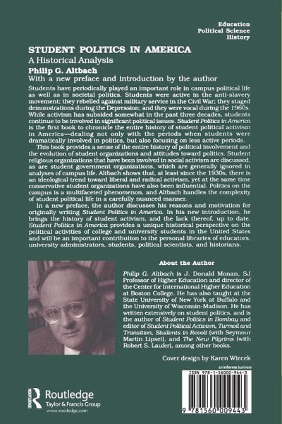 Students have periodically played an important role in campus political life as well as in societal politics. Students were active in the anti-slavery movement; they rebelled against military service in the Civil War; they staged demonstrations during the Depression; and they were vocal during the 1960s. While activism has subsided somewhat in the past three decades, students continue to be involved in significant political issues. Student Politics in America is the first book to chronicle the entire history of student political activism in America-dealing not only with the periods when students were dramatically involved in politics, but also focusing on less active periods. This book provides a sense of the entire history of political involvement and the evolution of student organizations and attitudes toward politics. Student religious organizations that have been involved in social activism are discussed, as are student government organizations, which are generally ignored in analyses of campus life. Altbach shows that, at least since the 1930s, there is an ideological trend toward liberal and radical activism, yet at the same time conservative student organizations have also been influential. Politics on the campus is a multifaceted phenomenon, and Altbach handles the complexity of student political life in a carefully nuanced manner. In a new preface, the author discusses his reasons and motivation for originally writing Student Politics in America. In his new introduction, he brings the history of student activism, and the lack thereof, up to date. Student Politics in America provides a unique historical perspective on the political activities of college and university students in the United States and will be an important contribution to the personal libraries of educators, university administrators, students, political scientists, and historians.