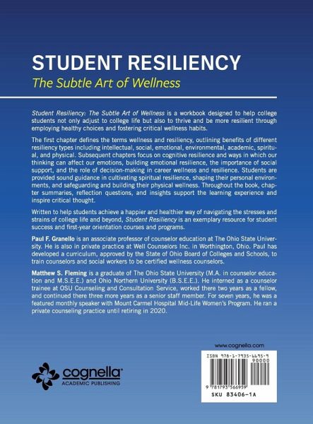 Student Resiliency: The Subtle Art of Wellness is a workbook designed to help college students not only adjust to college life but also to thrive and be more resilient through employing healthy choices and fostering critical wellness habits. The first chapter defines the terms wellness and resiliency, outlining benefits of different resiliency types including intellectual, social, emotional, environmental, academic, spiritual, and physical. Subsequent chapters focus on cognitive resilience and ways in which our thinking can affect our emotions, building emotional resilience, the importance of social support, and the role of decision-making in career wellness and resilience. Students are provided sound guidance in cultivating spiritual resilience, shaping their personal environments, and safeguarding and building their physical wellness. Throughout the book, chapter summaries, reflection questions, and insights support the learning experience and inspire critical thought. Written to help students achieve a happier and healthier way of navigating the stresses and strains of college life and beyond, Student Resiliency is an exemplary resource for student success and first-year orientation courses and programs.