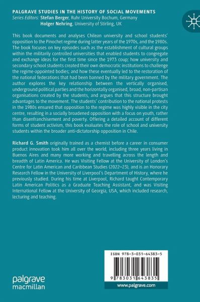 This book documents and analyses Chilean university and school students' opposition to the Pinochet regime during the latter years of the 1970s and the 1980s. The book focuses on key episodes such as the establishment of cultural groups within the militarily controlled universities that enabled students to congregate and exchange ideas for the first time since the 1973 coup; how university and secondary school students created their own democratic institutions to challenge the regime-appointed bodies; and how these eventually led to the restoration of the national federations that had been banned by the military government. The author explores the key relationship between the vertically organised, underground political parties, and the horizontally organised, broad, non-partisan organisations created by the students, arguing that this structure brought advantages to the movement. The students' contribution to the national protests in the 1980s ensured that opposition to the regime was highly visible in the city centre, resulting in a socially broadened opposition with a focus on youth, rather than disenfranchisement and poverty. Offering a detailed account of different forms of student activism, this book evaluates the role of school and university students within the broader anti-dictatorship opposition in Chile.