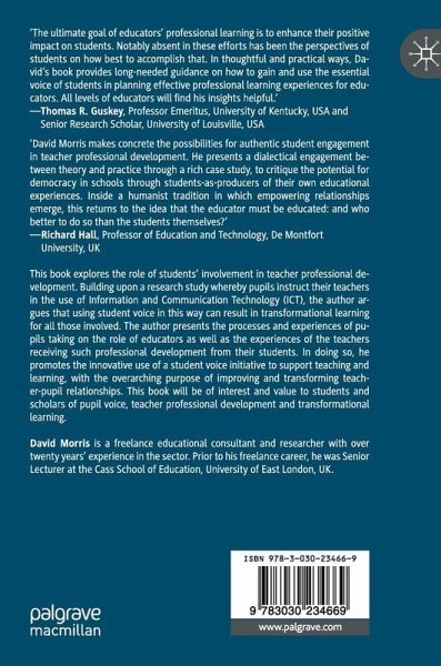 This book explores the role of students' involvement in teacher professional development. Building upon a research study whereby pupils instruct their teachers in the use of Information and Communication Technology (ICT), the author argues that using student voice in this way can result in transformational learning for all those involved. The author presents the processes and experiences of pupils taking on the role of educators as well as the experiences of the teachers receiving such professional development from their students. In doing so, he promotes the innovative use of a student voice initiative to support teaching and learning, with the overarching purpose of improving and transforming teacher-pupil relationships. This book will be of interest and value to students and scholars of pupil voice, teacher professional development and transformational learning.