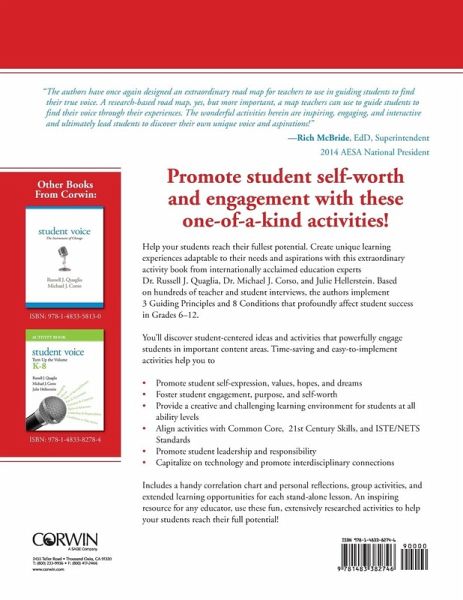 Promote student self worth and engagement with these one-of-a-kind activities! Promote student self-expression, values, hopes and dreams with this extraordinary activity book from experts Dr. Russell Quaglia, Michael Corso and Julie Hellerstein. Based on hundreds of interviews, timesaving and easy-to-implement activities help you to: Foster student engagement, purpose, leadership and self worth Provide creative and challenging activities for all levels Align activities with Common Core and ISTE Standards and 21st Century Skills Capitalize on technology and promote interdisciplinary connections Includes a handy correlation chart and extended learning opportunities. This inspiring, one-of-a-kind book will help your 6th-12th grade students soar to success!