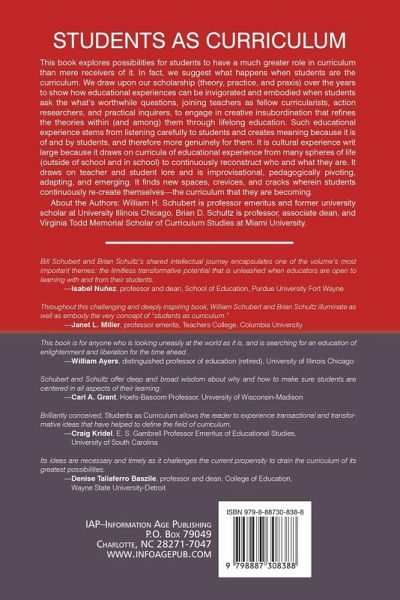 William H. Schubert in Professor Emeritus and former University Scholar from the University of Illinois Chicago. He is recipient of the Lifetime Achievement Award in Curriculum Studies from American Educational Research Association, a Fellow of the International Academy of Education, former president of the John Dewey Society, and The Society for the Study of Curriculum History, and recently the Society of Professors of Education honored him by establishing the William H. Schubert Award for Curricular Speculation. His 20-plus books, over 200 articles and chapters, and related documents are available in the William H. Schubert Curriculum Studies Collection in the Zach S. Henderson Library of Georgia Southern University. Brian D. Schultz is Professor and Virginia Todd Memorial Scholar of Curriculum Studies in the Department of Teaching, Curriculum & Educational Inquiry and Associate Dean in the College of Education, Health & Society at Miami University. Prior to joining Miami's faculty, Brian was Bernard J. Brommel Distinguished Research Professor and Chair of the Department of Educational Inquiry & Curriculum Studies at Northeastern Illinois University. Brian has served the field as president of Society of Professors of Education, factotum and treasurer of Professors of Curriculum, and in leadership roles with the American Educational Research Association. He is the author of Spectacular Things Happen Along the Way: Lessons from an Urban Classroom, and Teaching in the Cracks: Openings and Opportunities for Student-Centered, Action-Focused Curriculum.