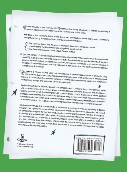 An indispensable reference for students studying the Court Specifically written to engage high-school students, Student's Guide to the Supreme Court presents a comprehensive overview of the history, traditions, and people of the highest court in the land. This one-stop source does not require any prior knowledge of the Supreme Court and covers topics that meet national high school curriculum standards. Part One consists of three informative essays: The Supreme Court: The Weakest or the Strongest Branch? How Does the President Nominate a Supreme Court Justice? Do They Matter? How Supreme Court Decisions Affect Modern American Life. Part Two is an alphabetical section of key words and legal concepts spanning abortion to writs of mandamus. The members of the current Roberts Court-including Sonia Sotomayor-are profiled here, as are all chief justices and notable associate justices. Part Three complements the first two sections with a generous sampling of influential primary source documents, including landmark decisions, excerpts from justices' papers, political cartoons, and constitutional provisions related to the Supreme Court. Key Features Easy-to-read Aligns with high school curriculum Unique three-part format