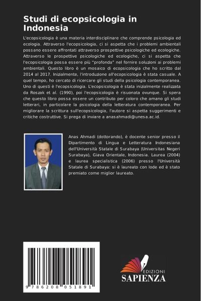 L'ecopsicologia è una materia interdisciplinare che comprende psicologia ed ecologia. Attraverso l'ecopsicologia, ci si aspetta che i problemi ambientali possano essere affrontati attraverso prospettive psicologiche ed ecologiche. Attraverso le prospettive psicologiche ed ecologiche, ci si aspetta che l'ecopsicologia possa essere più ¿profondä nel fornire soluzioni ai problemi ambientali. Questo libro è un mosaico di ecopsicologia che ho scritto dal 2014 al 2017. Inizialmente, l'introduzione all'ecopsicologia è stata casuale. A quel tempo, ho cercato di ricercare gli studi della psicologia contemporanea. Uno di questi è l'ecopsicologia. L'ecopsicologia è stata inizialmente realizzata da Roszak et al. (1990), poi l'ecopsicologia è risuonata ovunque. Si spera che questo libro possa essere un contributo per coloro che amano gli studi letterari, in particolare la psicologia della letteratura contemporanea. Per migliorare la scrittura sull'ecopsicologia, l'autore si aspetta suggerimenti e critiche costruttive. Si prega di inviare a anasahmadi@unesa.ac.id.