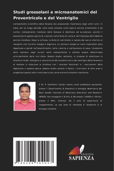 L'allevamento scientifico della faraona sta acquisendo importanza negli ultimi anni. In India, per un lungo periodo, sono state allevate come specie avicole ornamentali e da cortile. L'allevamento intensivo della faraona è destinato ad accelerare, poiché il potenziale di questa specie di crescere come fonte di carne è nell'interesse dell'industria avicola mondiale. Dopo la schiusa, la fonte di nutrimento si sposta dal sacco vitellino al mangime che l'uccello mangia e digerisce. Lo stomaco svolge un ruolo importante nella digestione e quindi nell'assorbimento, nella crescita e nell'aumento di peso. L'anatomia dello stomaco negli uccelli varia notevolmente e sembra essere determinata principalmente dalla loro dieta. Questo studio, pertanto, si propone di analizzare la struttura (lorda, istologica e istochimica) del proventricolo e del ventriglio della faraona e di mettere in relazione la struttura con i processi funzionali e i meccanismi della digestione in questa specie. Questo studio aiuterà in futuro i ricercatori di altre aree a progettare questo pollo come specie da carne economicamente importante.