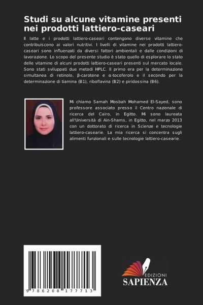 Il latte e i prodotti lattiero-caseari contengono diverse vitamine che contribuiscono ai valori nutritivi. I livelli di vitamine nei prodotti lattiero-caseari sono influenzati da diversi fattori ambientali e dalle condizioni di lavorazione. Lo scopo del presente studio è stato quello di esplorare lo stato delle vitamine di alcuni prodotti lattiero-caseari presenti sul mercato locale. Sono stati sviluppati due metodi HPLC. Il primo era per la determinazione simultanea di retinolo, ¿-carotene e ¿-tocoferolo e il secondo per la determinazione di tiamina (B1), riboflavina (B2) e piridossina (B6).
