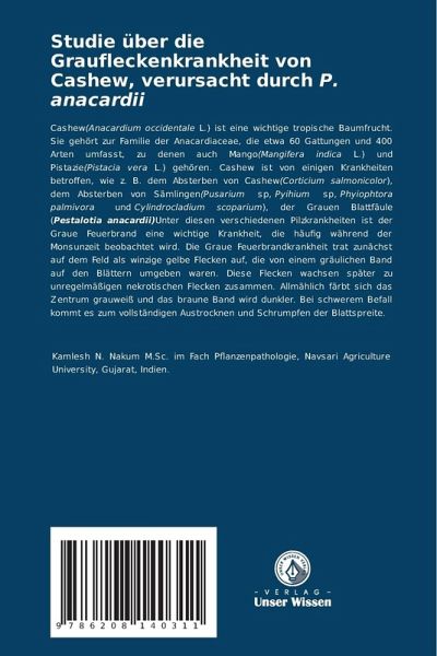 Cashew(Anacardium occidentale L.) ist eine wichtige tropische Baumfrucht. Sie gehört zur Familie der Anacardiaceae, die etwa 60 Gattungen und 400 Arten umfasst, zu denen auch Mango(Mangifera indica L.) und Pistazie(Pistacia vera L.) gehören. Cashew ist von einigen Krankheiten betroffen, wie z. B. dem Absterben von Cashew(Corticium salmonicolor), dem Absterben von Sämlingen(Pusarium sp, Pyihium sp, Phyiophtora palmivora und Cylindrocladium scoparium), der Grauen Blattfäule (Pestalotia anacardii)Unter diesen verschiedenen Pilzkrankheiten ist der Graue Feuerbrand eine wichtige Krankheit, die häufig während der Monsunzeit beobachtet wird. Die Graue Feuerbrandkrankheit trat zunächst auf dem Feld als winzige gelbe Flecken auf, die von einem gräulichen Band auf den Blättern umgeben waren. Diese Flecken wachsen später zu unregelmäßigen nekrotischen Flecken zusammen. Allmählich färbt sich das Zentrum grauweiß und das braune Band wird dunkler. Bei schwerem Befall kommt es zum vollständigenAustrocknen und Schrumpfen der Blattspreite.