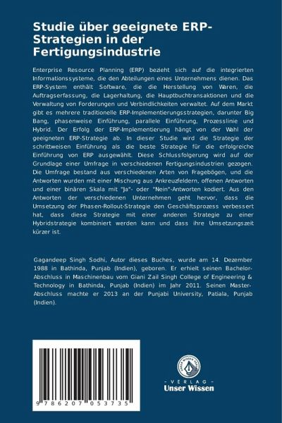 Enterprise Resource Planning (ERP) bezieht sich auf die integrierten Informationssysteme, die den Abteilungen eines Unternehmens dienen. Das ERP-System enthält Software, die die Herstellung von Waren, die Auftragserfassung, die Lagerhaltung, die Hauptbuchtransaktionen und die Verwaltung von Forderungen und Verbindlichkeiten verwaltet. Auf dem Markt gibt es mehrere traditionelle ERP-Implementierungsstrategien, darunter Big Bang, phasenweise Einführung, parallele Einführung, Prozesslinie und Hybrid. Der Erfolg der ERP-Implementierung hängt von der Wahl der geeigneten ERP-Strategie ab. In dieser Studie wird die Strategie der schrittweisen Einführung als die beste Strategie für die erfolgreiche Einführung von ERP ausgewählt. Diese Schlussfolgerung wird auf der Grundlage einer Umfrage in verschiedenen Fertigungsindustrien gezogen. Die Umfrage bestand aus verschiedenen Arten von Fragebögen, und die Antworten wurden mit einer Mischung aus Ankreuzfeldern, offenen Antworten und einer binären Skala mit "Ja"- oder "Nein"-Antworten kodiert. Aus den Antworten der verschiedenen Unternehmen geht hervor, dass die Umsetzung der Phasen-Rollout-Strategie den Geschäftsprozess verbessert hat, dass diese Strategie mit einer anderen Strategie zu einer Hybridstrategie kombiniert werden kann und dass ihre Umsetzungszeit kürzer ist.