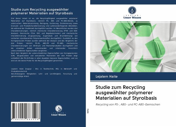Ziel dieser Arbeit ist es, die Recyclingfähigkeit ausgewählter polymerer Materialien auf Styrolbasis, nämlich PS, ABS und PC-ABS-Blends, zu untersuchen. Materialsammlung, Reinigung, Sortierung, Zerkleinerung sowie Granulat- und Produktcharakterisierung sind aufeinanderfolgende Aktivitäten, die während der Studienzeit durchgeführt werden. Im Wesentlichen wurden drei Charakterisierungen, nämlich chemische Charakterisierung (FTIR- und EDX-Analyse), thermische (TGA, DSC und Kegelkalorimeter) und mechanische Charakterisierung (Zugspannung, Zugmodule und Bruchdehnung) von sortierten styrolbasierten Polymerwerkstoffen durchgeführt. Zusätzlich zu den formgepressten Proben wurden während der Analyse und des Vergleichs der drei Proben, nämlich PS-HI, ABS-FR und PC-ABS, mechanische Charakterisierungen von 3D-Druck- und Filamentprodukten durchgeführt und die einzelnen Artikel untereinander und miteinander hinsichtlich unterschiedlicher Eigenschaften verglichen. Nach dem Vergleich der unterschiedlichen Eigenschaften von formgepressten (CM), 3D-gedruckten und extrudierten Filamenten der drei Proben zeigt schließlich die PS-HI-Probe in allen Aspekten bessere Eigenschaften, und sie wird als die beste Probe für die Recyclingfähigkeit genommen.