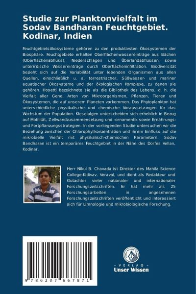 Feuchtgebietsökosysteme gehören zu den produktivsten Ökosystemen der Biosphäre. Feuchtgebiete erhalten Oberflächenwassereinträge aus Bächen (Oberflächenabfluss), Niederschlägen und Überlandabflüssen sowie unterirdische Wassereinträge durch Oberflächeninfiltration. Biodiversität bezieht sich auf die Variabilität unter lebenden Organismen aus allen Quellen, einschließlich u. a. terrestrischer, Süßwasser- und mariner aquatischer Ökosysteme und der ökologischen Komplexe, zu denen sie gehören. Hosetti bezeichnete sie als die Bibliothek des Lebens, d. h. die Vielfalt aller Gene, Arten von Mikroorganismen, Pflanzen, Tieren und Ökosystemen, die auf unserem Planeten vorkommen. Das Phytoplankton hat unterschiedliche physikalische und chemische Voraussetzungen für das Wachstum der Population. Kieselalgen unterscheiden sich erheblich in Bezug auf Motilität, Zellwandzusammensetzung und -ornamentik sowie Ernährungs- und Fortpflanzungsstrategien. In der vorliegenden Studie untersuchen wir die Beziehung zwischen der Chlorophyllkonzentration und ihrem Einfluss auf die mikrobielle Vielfalt mit physikalisch-chemischen Parametern. Sodav Bandharan ist ein temporäres Feuchtgebiet in der Nähe des Dorfes Vellan, Kodinar.