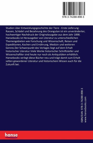 Studien über Entwicklungsgeschichte der Tiere - Erste Lieferung: Rassen, Schädel und Bezahnung des Orangutan ist ein unveränderter, hochwertiger Nachdruck der Originalausgabe aus dem Jahr 1898.
