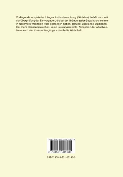 Inhaltsübersicht.- 1. Die bildungspolitische Ausgangslage.- 2. Die Konzeption der Integrierten Gesamthochschule.- 3. Die Bewährungskontrolle und ihr Untersuchungsansatz.- 4. Der Verlauf des Studienschicksals über einen Zeitraum von 8 Jahren.- 4.1. Die Studierfähigkeit und ihre Veränderung während des Studiums.- 4.2. Studienziel und Studienwahl.- 4.3. Die Studiendauer bis zur Zwischenprüfung und bis zum Hauptexamen.- 4.4. Der Studienerfolg in der Zwischenprüfung und im Hauptexamen.- 5. Chancengleichheit.- 6. Berufseinmündung.- 7. Die Relevanz von Leistungsmerkmalen als Prädiktoren künftigen Studien- und Berufserfolgs.- 8. Qualität und Effizienz der Gesamthochschule aus der Retrospektive ihrer Absolventen.- Literatur-Verzeichnis.- Verzeichnis der Tabellen und Abbildungen.