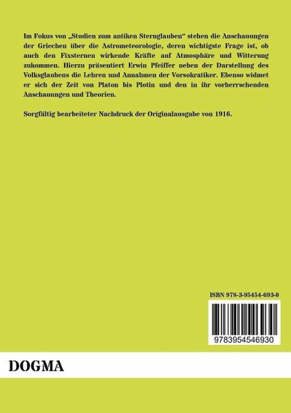 Im Fokus von Studien zum antiken Sternglauben stehen die Anschauungen der Griechen über die Astrometeorologie, deren wichtigste Frage ist, ob auch den Fixsternen wirkende Kräfte auf Atmosphäre und Witterung zukommen. Hierzu präsentiert Erwin Pfeiffer neben der Darstellung des Volksglaubens die Lehren und Annahmen der Vorsokratiker. Ebenso widmet er sich der Zeit von Platon bis Plotin und den in ihr vorherrschenden Anschauungen und Theorien. Sorgfältig bearbeiteter Nachdruck der Originalausgabe von 1916.