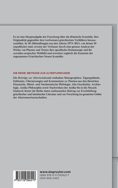 Es ist eine Hauptaufgabe der Forschung über die Römische Komödie, ihre Originalität gegenüber den (verlorenen) griechischen Vorbildern herauszustellen. In 30 Abhandlungen aus den Jahren 1973-2013, von denen 10 unpubliziert sind, erweist der Verfasser durch eine genaue Analyse der Werke von Plautus und Terenz ihre spezifische Dramaturgie und ihr zuweilen utopisches Weltbild und erweitert zugleich die Kenntnis der sog.Griechischen Neuen Komödie.