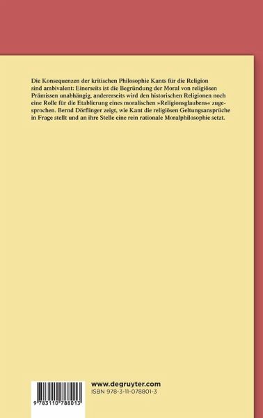 Für Kant spielt die Religion im Hinblick auf die moralische Lebensführung weder in geltungstheoretischer noch in motivationstheoretischer Hinsicht eine wesentliche Rolle. Deshalb ist er auch vom tendenziellen Ende der historischen Religionen überzeugt. Mit schonungsloser Kritik wendet sich Kant gegen den dogmatischen Bestand der Offenbarungsreligionen und gegen religiöse Praktiken, die er als "Afterdienst" bzw. als "Wahnglauben" brandmarkt. Aber schon die Zeitgenossen haben mit einiger Irritation zur Kenntnis genommen, dass Kant auf der anderen Seite den historischen Religionen für die Gegenwart noch die nützliche Funktion eines 'Vehikels' für die Etablierung eines moralischen "Religionsglaubens" zuspricht. Bernd Dörflinger hat sich in seinen richtungsweisenden Studien die Aufgabe gestellt, im Rahmen sorgfältiger Analysen die Komplexität von Kants religionsphilosophischen Überlegungen herauszuarbeiten, zugleich aber zu zeigen, was diese im Kontext einer veränderten historischen Situation bedeuten, ohne theologischen Versuchen der Vereinnahmung anheim zu fallen.