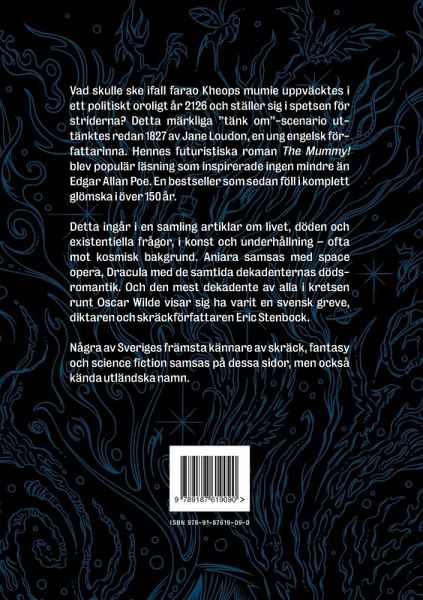 Vad skulle ske ifall farao Kheops mumie uppväcks i ett politiskt oroligt år 2126 och ställer sig i spetsen för striderna? Detta märkliga "tänk om"-scenario uttänktes redan 1826 av Jane Loudon, en ung engelsk författarinna. Hennes futuristiska roman The Mummy! blev populär läsning som inspirerade ingen mindre än Edgar Allan Poe. En bestseller som sedan föll i komplett glömska i över 150 år. Detta ingår i en samling artiklar om livet, döden och existentiella frågor, i konst och underhållning -- ofta mot kosmisk bakgrund. Aniara samsas med space opera, Dracula med de samtida dekadenternas dödsromantik. Och den mest dekadente av alla i kretsen runt Oscar Wilde visar sig ha varit en svensk greve, diktaren och skräckförfattaren Eric Stenbock. Några av Sveriges främsta kännare av skräck, fantasy och science fiction samsas på dessa sidor, men också kända utländska namn. Detta är andra fristående delen i Alephs faktaserie Fantastikens mörker och ljus.