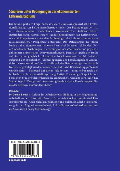 Die Studie geht der Frage nach, inwiefern eine rassismuskritische Professionalisierung von Lehramtsstudierenden unter den Bedingungen der sich im Lehramtsstudium verdichtenden ökonomisierten Studienstrukturen stattfinden kann. Hierzu werden Vermittlungsprozesse von Reflexionswissen und Kompetenzen unter den Bedingungen des Lehramtsstudiums aus rassismuskritischer Perspektive untersucht. Das Datenkorpus der Studie basiert auf umfangreichen, teilweise über zwei Semester reichenden Teilnehmenden Beobachtungen in erziehungswissenschaftlichen und physikdidaktischen universitären Lehrveranstaltungen. Demnach greift die Studie auf einen ethnographisch informierten Forschungsansatz zurück, bei dem aufgrund der spezifischen Feldbedingungen des Forschungsfeldes 'universitäre Lehrveranstaltung' bereits während der Beobachtungen umfassende Notizen angefertigt werden konnten. Ausführliche Beobachtungsprotokolle wurden dann - basierend auf diesen Feldnotizen - unmittelbar nach den beobachteten Lehrveranstaltungen angefertigt. Forschungs-Gespräche mit beteiligten Studierenden ergänzen die empirische Grundlage der Studie. Die Studie folgt in Design und Auswertungsmethode dem Forschungsparadigma der Reflexiven Grounded Theory.