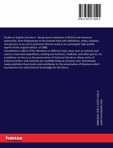 Studies in English Literature - Being typical selections of British and American authorship, from Shakespeare to the present time with definitions, notes, analyses, and glossary as an aid to systematic literary study is an unchanged, high-quality reprint of the original edition of 1880.Hansebooks is editor of the literature on different topic areas such as research and science, travel and expeditions, cooking and nutrition, medicine, and other genres. As a publisher we focus on the preservation of historical literature. Many works of historical writers and scientists are available today as antiques only. Hansebooks newly publishes these books and contributes to the preservation of literature which has become rare and historical knowledge for the future.