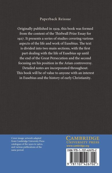 Originally published in 1929, this book was formed from the content of the Thirlwall Prize Essay for 1927. It presents a series of studies covering various aspects of the life and work of Eusebius. The text is divided into two main sections, with the first part dealing with the life of Eusebius up until the end of the Great Persecution and the second focusing on his position in the Arian controversy. Detailed notes are incorporated throughout. This book will be of value to anyone with an interest in Eusebius and the history of early Christianity.