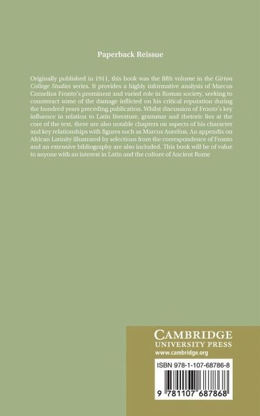 Originally published in 1911, this book was the fifth volume in the Girton College Studies series. It provides a highly informative analysis of Marcus Cornelius Fronto's prominent and varied role in Roman society, seeking to counteract some of the damage inflicted on his critical reputation during the hundred years preceding publication. Whilst discussion of Fronto's key influence in relation to Latin literature, grammar and rhetoric lies at the core of the text, there are also notable chapters on aspects of his character and key relationships with figures such as Marcus Aurelius. An appendix on African Latinity illustrated by selections from the correspondence of Fronto and an extensive bibliography are also included. This book will be of value to anyone with an interest in Latin and the culture of Ancient Rome.