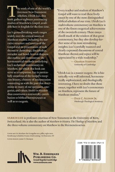 Translated by Rosemary Selle The work of one of the world's foremost New Testament scholars, Ulrich Luz, this book gathers eighteen penetrating studies of Matthew's Gospel, available here in English for the first time. Luz's groundbreaking work ranges widely over the critical issues of Matthean studies, including the narrative structure and sources of the Gospel and its presentation of such themes as christology, discipleship, miracles, and Israel. Several chapters also outline and demonstrate the hermeneutical methods underlying Luz's acclaimed commentary on Matthew, for which this book can serve as a companion. Luz is particularly conscious of the Gospel's reception history, a history of interpretation connecting us with the past that determines so many of our questions, categories, and values. Studies in Matthew thus constitutes a noteworthy contribution to biblical hermeneutics as well as to exegesis.