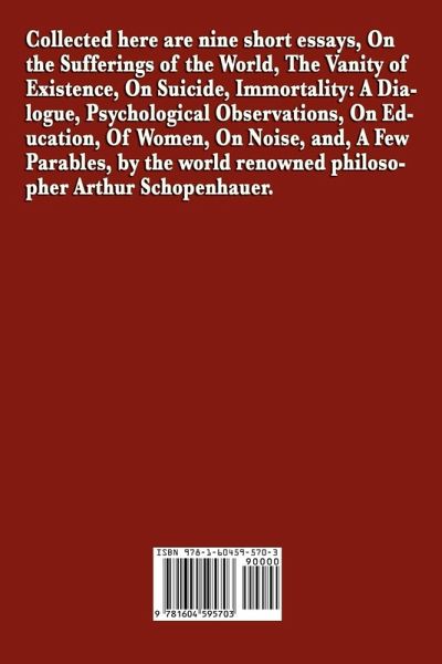 Collected here are nine short essays, On the Sufferings of the World, The Vanity of Existence, On Suicide, Immortality: A Dialogue, Psychological Observations, On Education, Of Women, On Noise, and, A Few Parables, by the world renowned philosopher Arthur Schopenhauer.