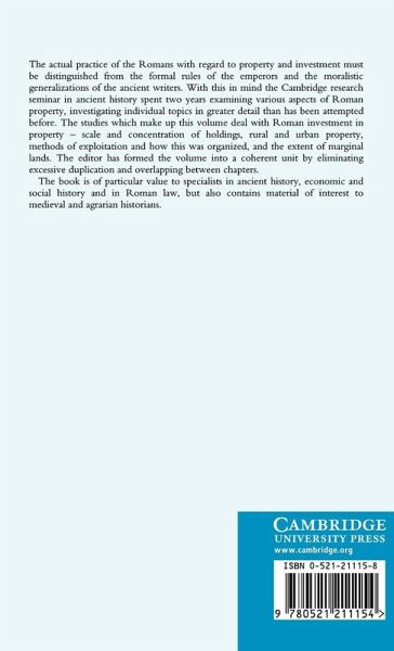 The actual practice of the Romans with regard to property and investment must be distinguished from the formal rules of the emperors and the moralistic generalizations of the ancient writers. With this in mind the Cambridge Research Seminar in Ancient History spent two years examining various aspects of Roman property, investigating individual topics in greater detail than has been attempted before. The studies which make up this volume deal with Roman investment in property - scale and concentration of holdings, rural and urban property, methods of exploitation and how this was organized, and the extent of marginal lands. The editor has formed the volume into a coherent unit by eliminating excessive duplication and overlapping between chapters. The book is of particular value to specialists in ancient history, economic and social history and in Roman law, but also contains materials of interest to medieval and agrarian historians.