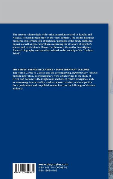 The book consists of 14 articles by the author, which present and deal with diverse problems of the two poets of Lesbos. Various questions on already transmitted poems, different readings, reconstructions, and interpretations of the new finds are proposed, but, most importantly, new approaches in general topics, such as the division of Sappho's work in Books, the logic leading to this division, the order of these Books, the contents of each of them, the interpretation of the surviving fragments, often quite different than before. A feature that characterizes the old-age poetry of Sappho is her anxiety about the posthumous fate of her poetry and her hope that Kleïs, her only daughter, will ensure its dissemination. Finally, the author investigates the communal festival of Hera in Lesbos, a festival performed in common with Zeus and Dionysus, the so-called "Lesbian Triad". The festival is specified as a welcome to the season of spring at the time of the vernal equinox. Also, the location of the temenos of Hera is investigated, close to Pyrrha of Lesbos, which was the site of Alcaeus' second exile.