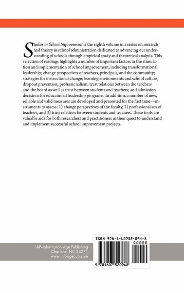 A volume in Research and Theory in Educational Administration Series Editors: Wayne K. Hoy, The Ohio State University and Michael DiPaola, The College of William and Mary Studies in School Improvement is the eighth volume in a series on research and theory in school administration dedicated to advancing our understanding of schools through empirical study and theoretical analysis. This selection of readings highlights a number of important factors in the stimulation and implementation of school improvement, including transformational leadership; change perspectives of teachers, principals, and the community; strategies for instructional change; learning environments and school culture; dropout prevention; professionalism; trust relations between the teachers and the board as well as trust between students and teachers; and admission decisions for educational leadership programs. In addition, a number of new, reliable and valid measures are developed and presented for the first time-instruments to assess: 1) change perspectives of the faculty, 2) professionalism of teachers, and 3) trust relations between students and teachers. These tools are valuable aids for both researchers and practitioners in their quest to understand and implement successful school improvement projects.