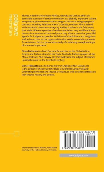 Introduction; F.Bateman & L.Pilkington 'An Unknown and Feeble Body': How Settler Colonialism Was Theorised in the Nineteenth Century; T.Foley Spenser, Purchas, and the Poetics of Colonial Settlement; D.Carey 'Dycheyng and Hegeying': The Material Culture of the Tudor Plantations in Ireland; J.P.Montano A Settled Question?: Charles, Lord Cornwallis, the Loss of America and the Mind of Empire; D.Dix International Anti-Colonialism: The Fenian Invasions of Canada; R.Young Indirect Rule in Australia: A Case Study in Settler Colonial Difference; B.Silverstein (En)gendering Faith?: Love, Marriage and the Evangelical Mission on the Settler-Colonial Frontier; C.McLisky 'Wanted! A Real White Australia': The Women's Movement, Whiteness and the Settler-colonial Project, 1900-1940; J.Carey From the Indigenous to the Indigent: Homelessness and Settler Colonialism in Hawai'i; L.E.Lyons Searching for the 'C' word: Museums, Art Galleries, and Settler Colonialism in Hawai'i; K.K.Kosasa A Dream Deterred: Palestine from Total War to Total Peace; J.Collins Displaced Nations: Israeli Settlers and Palestinian Refugees; S.D.Hassan Telling the End of the Settler Colonial Story; L.Veracini JM Coetzee and the Idea of Africa; D.Attwell Zionism Then and Now; S.Makdisi Where We Belong: South Africa as Settler Colony and the Calibration of African and Afrikaner Indigeneity; E.Boehmer Race and the Trace of History; P.Wolfe