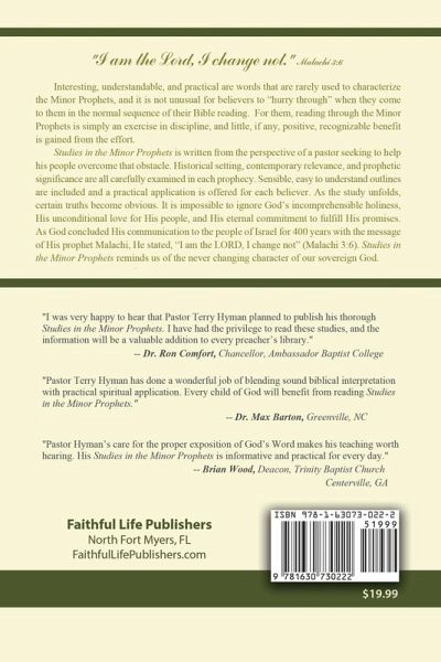 Interesting, understandable, and practical are words that are rarely used to characterize the Minor Prophets, and it is not unusual for believers to "hurry through" when they come to them in the normal sequence of their Bible reading. For them, reading through the Minor Prophets is simply an exercise in discipline, and little, if any, positive, recognizable benefit is gained from the effort. Yet II Timothy 3:16 tells us that "All scripture is given by inspiration of God, and is profitable for doctrine, for reproof, for correction, for instruction in righteousness." No exclusion is made for the Minor Prophets. Studies in the Minor Prophets is written from the perspective of a pastor seeking to help his people overcome that obstacle. Historical setting, contemporary relevance, and prophetic significance are all carefully examined in each prophecy. Sensible, easy to understand outlines are included and a practical application is offered for each believer. As the study unfolds, certain truths become obvious. It is impossible to ignore God's incomprehensible holiness, His unconditional love for His people, and His eternal commitment to fulfill His promises. He hasn't changed. Though He deals with us differently, (we are, after all, on the other side of the cross), His plan and purpose have not changed. As God concluded His communication to the people of Israel for 400 years with the message of His prophet Malachi, He stated, "I am the LORD, I change not" (Malachi 3:6). Studies in the Minor Prophets reminds us of the never changing character of our sovereign God.