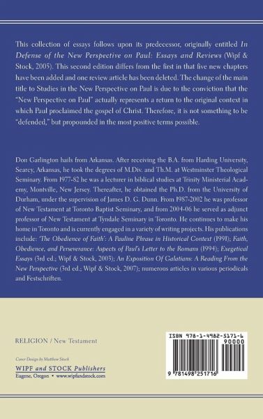 This collection of essays follows upon its predecessor, originally entitled In Defense of the New Perspective on Paul: Essays and Reviews (Wipf and Stock, 2005). This second edition differs from the first in that five new chapters have been added and one review article has been deleted. The change of the main title to Studies in the New Perspective on Paul is due to the conviction that the "New Perspective on Paul" actually represents a return to the original context in which Paul proclaimed the gospel of Christ. Therefore, it is not something to be "defended," but propounded in the most positive terms possible.