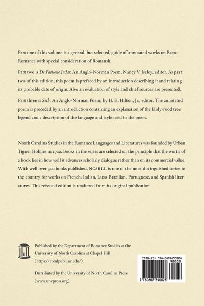 Part one of this volume is a general, but selected, guide of annotated works on Raeto-Romance with special consideration of Romansh. Part two is De Passione Judas: An Anglo-Norman Poem, Nancy V. Iseley, editor. As part two of this edition, this poem is prefaced by an introduction describing it and relating its probable date of origin. Also an evaluation of style and chief sources are presented. Part three is Seth: An Anglo-Norman Poem, by H. H. Hilton, Jr., editor. The annotated poem is preceded by an introduction containing an explanation of the Holy-rood tree legend and a description of the language and style used in the poem.
