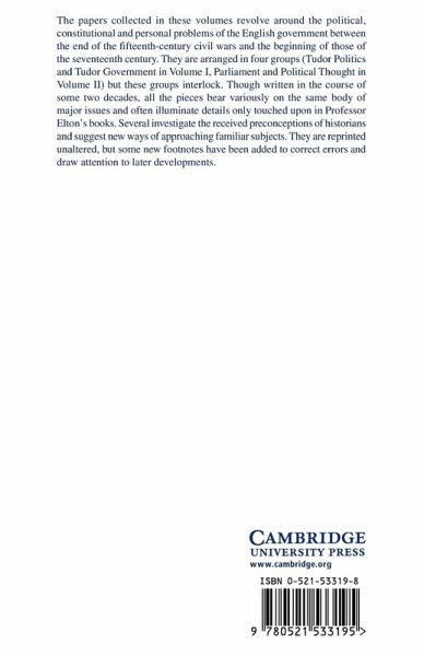 The papers collected in these volumes revolve around the political, constitutional and personal problems of the English government between the end of the fifteenth-century civil wars and the beginning of those of the seventeenth century. Previously published in a great variety of places, none of them appeared in book form before. They are arranged in four groups (Tudor Politics and Tudor Government in Volume I, Parliament and Political Thought in Volume II) but these groups interlock. Though written in the course of some two decades, all the pieces bear variously on the same body of major issues and often illuminate details only touched upon in Professor Elton's books. Several investigate the received preconceptions of historians and suggest new ways of approaching familiar subjects. They are reprinted unaltered, but some new footnotes have been added to correct errors and draw attention to later developments.