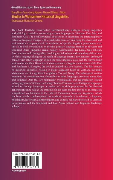 This book facilitates constructive interdisciplinary dialogue among linguistics and philology specialists concerning various languages in Vietnam, East Asia, and Southeast Asia. The book's principal objective is to investigate the interdisciplinary nature of language change, with a particular focus on analyzing the structural and socio-cultural components of the evolution of specific linguistic phenomena over time. The book concentrates on the five primary language families in the East and Southeast Asian linguistic arena, namely Austroasiatic, Tai-Kadai, Sino-Tibetan, Austronesian, and Hmong-Mien. In doing so, it develops understanding of the extent to which language change is the result of language-internal mechanisms, prolonged contact with other languages within the same linguistic area, and the surrounding socio-cultural milieu. Given that Vietnam presents a linguistic microcosm of the East and Southeast Asia region, the book is divided into two sections. The first centers on historical linguistics relating to major languages based in Vietnam, including Vietnamese and its significant neighbors, Tay and Nung. The subsequent section examines the transformations observable in other languages prevalent across East and Southeast Asia that are historically, typologically, and geographically related to languages from Vietnam, including Chinese, Formosan, and Philippine languages, as well as Hmongic languages. A product of a workshop sponsored by the Harvard Yenching Institute held at the Institute of Sino-Nom Studies, this book encompasses a significant contribution to the field of Vietnamese historical linguistics, which has been notably underexplored in academic research. It is relevant to linguists, philologists, historians, anthropologists, and cultural scholars interested in Vietnam in particular, and the Southeast and East Asian cultural and linguistic landscape at large.