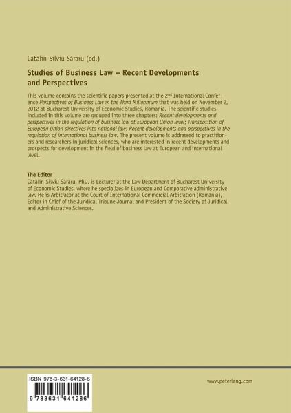 This volume contains the scientific papers presented at the 2nd International Conference Perspectives of Business Law in the Third Millennium that was held on November 2, 2012 at Bucharest University of Economic Studies, Romania. The scientific studies included in this volume are grouped into three chapters: Recent developments and perspectives in the regulation of business law at European Union level; Transposition of European Union directives into national law; Recent developments and perspectives in the regulation of international business law. The present volume is addressed to practitioners and researchers in juridical sciences, who are interested in recent developments and prospects for development in the field of business law at European and international level.