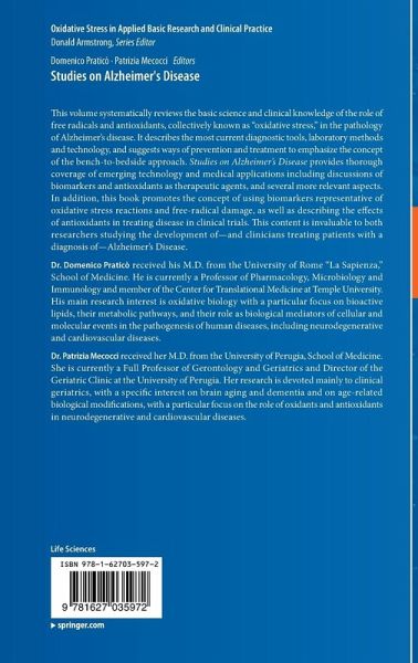 Section 1: Hypotheses.- Oxidative stress: impact in neuroscience research.- Oxidative stress and Alzheimer's disease.- Inflammation and Oxidation: a link in Alzheimer' disease pathogenesis.- GAPDH:beta-amyloid mediated iron accumulation in Alzheimer's disease.- Abeta in mitochondria: one piece in the Alzheimer's disease puzzle.- The role of the plasma membrane redox system in the pathognesis of Alzheimer's disease.- Section 2: Mechanisms.- Metal dysfunction in Alzheimer's disease.- Brain Oxidative Stress in the Pathogenesis and Progression of Alzheimer's Disease.- Cholesterol metabolism and oxidative stress in Alzheimer's disease.- Brain hypometabolism, oxidative stress, maternal transmission and risk of late-onset Alzheimer's disease.- Stress and HPA axis dysfunction in Alzheimer's disease.- Section 3: Clinics.- Diabetes mellitus and its impact on sporadic Alzheimer's disease.- Peripheral biomarkers of oxidative tress in Alzheimer's disease.- Nutrition lifestyle and oxidative stress: prevention in Alzheimer's disease.- Are antioxidants food and nutrients useful in preventing cognitive decline?.- Antioxidant clinical trials in Mild Cognitive Impairment and Alzheimer's disease.