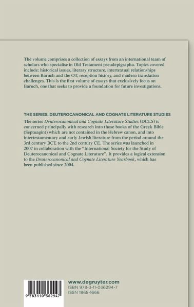 There has been widespread neglect by scholars of deuterocanonical books, especially those (e.g., Baruch) that are thought to lack originality. This book seeks to address this lacuna by investigating some of the major interpretive issues in Baruchan scholarship. The volume comprises a collection of essays from an international team of scholars who specialise in Second Temple Judaism and Old Testament pseudepigrapha. Topics covered include: historical issues (the person of Baruch), literary structure, intertextual relationships between Baruch and the OT (Jeremiah, Isaiah), reception history (Christian and Jewish), and modern translation challenges. This is the first volume of essays that exclusively focus on Baruch and one that seeks to provide a foundation for future investigations.