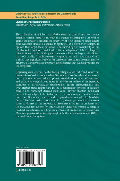 This collection of articles on oxidative stress in clinical practice surveys essential current research in what is a rapidly evolving field. As well as giving the reader a mechanistic overview of how oxidative stress affects cardiovascular disease, it analyzes the potential of a number of therapeutic options that target these pathways. Understanding the complexity of the cellular redox system could lead to the development of better targeted interventions that facilitate patient recovery. Even as large-scale clinical trials of so-called 'simple' antioxidant approaches such as vitamins C and E show that significant benefits for cardiovascular patients remain elusive, Studies on Cardiovascular Disorders demonstrates that such approaches are too simplistic.