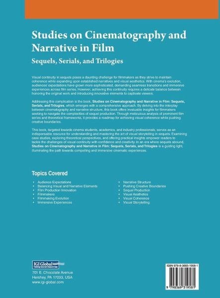 Visual continuity in sequels poses a daunting challenge for filmmakers as they strive to maintain coherence while expanding upon established narratives and visual aesthetics. With cinema's evolution, audiences' expectations have grown more sophisticated, demanding seamless transitions and immersive experiences across film series. However, achieving this continuity requires a delicate balance between honoring the original work and introducing innovative elements to captivate viewers. Addressing this complication is the book, Studies on Cinematography and Narrative in Film: Sequels, Serials, and Trilogies , which emerges with a comprehensive approach. By delving into the interplay between cinematography and narrative structure, this book offers invaluable insights for filmmakers seeking to navigate the complexities of sequel production. Through meticulous analysis of prominent film series and theoretical frameworks, it provides a roadmap for achieving visual coherence while pushing creative boundaries.
