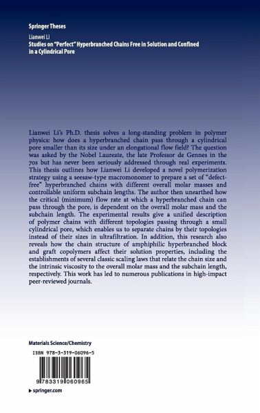 Lianwei Li's Ph.D. thesis solves a long-standing problem in polymer physics: how does a hyperbranched chain pass through a cylindrical pore smaller than its size under an elongational flow field? The question was asked by the Nobel Laureate, the late Professor de Gennes in the 70s but has never been seriously addressed through real experiments. This thesis outlines how Lianwei Li developed a novel polymerization strategy using a seesaw-type macromonomer to prepare a set of "defect-free" hyperbranched chagins with different overall molar masses and controllable uniform subchain lengths. The author then unearthed how the critical (minimum) flow rate at which a hyperbranched chain can pass through the pore, is dependent on the overall molar mass and the subchain length. The experimental results give a unified description of polymer chains with different topologies passing through a small cylindrical pore, which enables us to separate chains by their topologies instead of their sizesin ultrafiltration. In addition, this research also reveals how the chain structure of amphiphilic hyperbranched block and graft copolymers affect their solution properties, including the establishments of several classic scaling laws that relate the chain size and the intrinsic viscosity to the overall molar mass and the subchain length, respectively. This work has led to numerous publications in high-impact peer-reviewed journals.