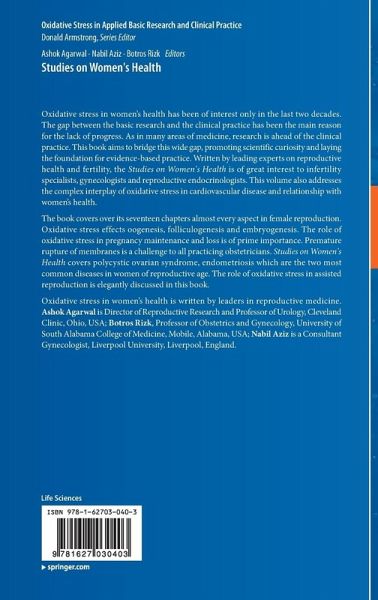 Early Embryonic Embryopathies and Oxidative Stress.- Methods for the Detection of ROS in Female Reproductive System.- Oxidative Stress and the Endometrium.- Oxidative Stress, Oogenesis and Folliculogenesis.- Placental Vascular Morphogenesis and Oxidative Stress.- The Use of Antioxidants in Pre-eclampsia.- Recurrent Pregnancy Loss and Oxidative Stress.- Pre-term Rupture of Membranes and Oxidative Stress.- Endometriosis and Oxidative Stress.- Oxidative Stress Impact on the Fertility of Women with Polycystic Ovary Syndrome.- The Menopause and Oxidative Stress.- OS in ART (includes IVM, oocyte cryo-preservation and hydrosapinx).- Antioxidant Strategies to Overcome OS in IVF-embryo Transfer.- Oxidative Insult after Ischemia/Reperfusion in Older Adults.- Relationship of Oxidative Stress with Cardiovascular Disease.- Female Infertility and Free Radicals: Potential Role in Adhesions and Endometriosis.- Impact of Life Style Factors on Oxidative Stress.