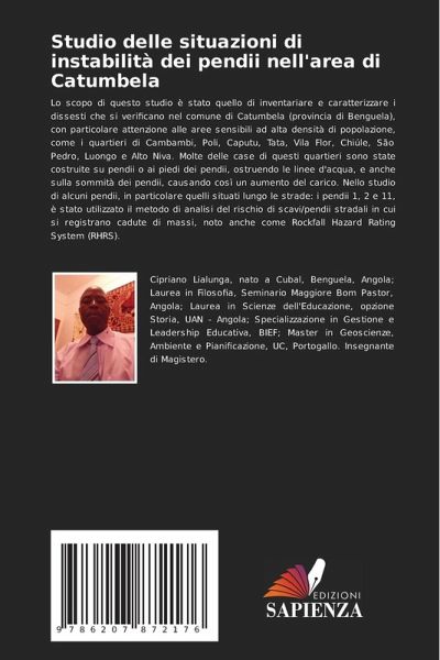 Lo scopo di questo studio è stato quello di inventariare e caratterizzare i dissesti che si verificano nel comune di Catumbela (provincia di Benguela), con particolare attenzione alle aree sensibili ad alta densità di popolazione, come i quartieri di Cambambi, Poli, Caputu, Tata, Vila Flor, Chiúle, São Pedro, Luongo e Alto Niva. Molte delle case di questi quartieri sono state costruite su pendii o ai piedi dei pendii, ostruendo le linee d'acqua, e anche sulla sommità dei pendii, causando così un aumento del carico. Nello studio di alcuni pendii, in particolare quelli situati lungo le strade: i pendii 1, 2 e 11, è stato utilizzato il metodo di analisi del rischio di scavi/pendii stradali in cui si registrano cadute di massi, noto anche come Rockfall Hazard Rating System (RHRS).