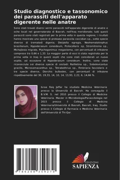 Sono stati trovati diversi vermi parassiti nell'apparato digerente di anatre e oche locali nel governatorato di Basrah, nell'Iraq meridionale; tutti questi parassiti sono stati registrati per la prima volta in questa regione; i risultati hanno mostrato una specie di protozoo parassita coccidian sp., sette specie diverse di trematodi digenia; Dietziella egregia, Neohematotrephus brasilianum, Hypoderaeum conoideum, Psilocollaris sp, Stromitrema sp., Michajlovia migrate, Ptychogonimus megastoma, con percentuali di infezione comprese tra 0,66 e 1,33. La maggior parte di essi è stata registrata per la prima volta in Iraq in questi ospiti che sono stati considerati un nuovo ospite, ad eccezione di Hypoderaeum conoideum. Inoltre, sono state riconosciute sei diverse specie di cestodi: Raillietina sp., Sobolevicantus gracilis, Microsomacanthus sp., Tetrabothrius sp., Fimbriaria fasciolaris e tre specie diverse, Diorchis bulbodes, con percentuali di infezione rispettivamente del 30, 19,33, 14, 10, 14, 13,93, 2,22, 6, 14,66 %.